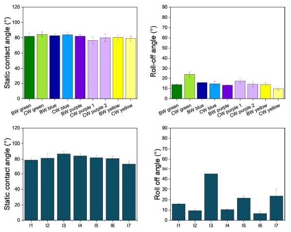 For water measurements at 23 °C, static contact angles were above 90°, and water drops started to roll easily on all measured ski waxes (rolling angle <25°); commercial ski waxes showed slightly lower roll-off angles compared with the corresponding bio-based prototypes (Figure 9).