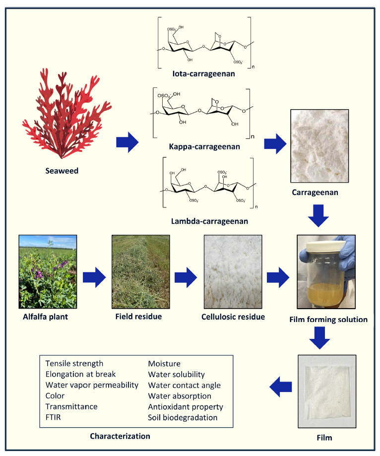 This study developed biodegradable alfalfa cellulosic residue–carrageenan films and used dropometer-based water contact angle measurements to compare how carrageenan type and loading changed film hydrophilicity within a broader packaging-property evaluation.