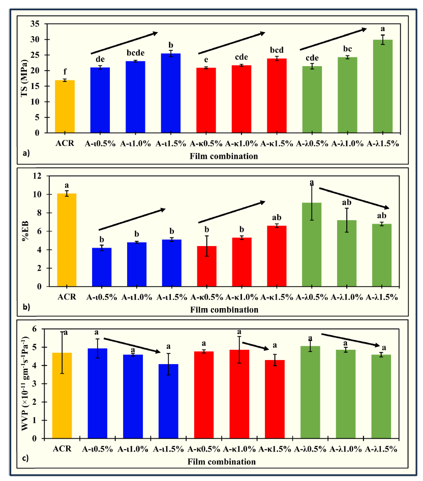 Across the same ACR-carrageenan matrix, tensile strength increased from 16.9 ± 0.4 MPa for ACR to 29.9 ± 1.5 MPa for ACR-l1.5%, while WCA moved downward across the composite set. In the paper’s overall interpretation, carrageenan reinforced the films while also making them more hydrophilic.
