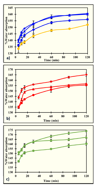 The more hydrophilic films also showed higher water absorption at 120 minutes. The ACR control reached 152.0 ± 0.2%, while ACR-l1.5% reached 173.9 ± 0.9%, which the paper discusses alongside the hydrophilic character introduced by carrageenan.