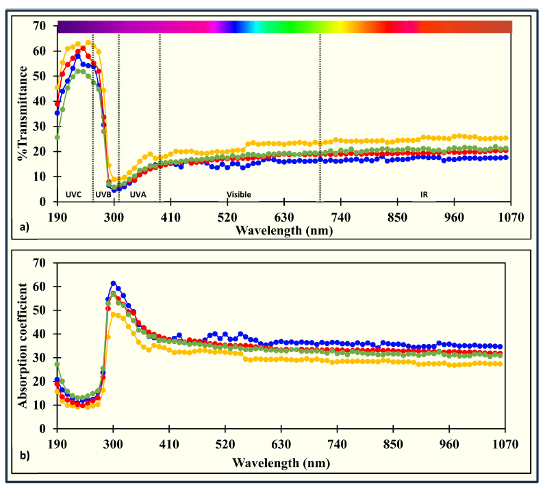 The same film matrix was also characterized for tensile strength, elongation at break, water vapor permeability, moisture content, water solubility, water absorption and kinetics, color, UV-Vis-IR transmittance, FTIR, antioxidant activity, and soil biodegradation. These measurements were used alongside WCA to interpret the films’ mechanical performance, moisture interaction, light-blocking behavior, and biodegradation behavior.