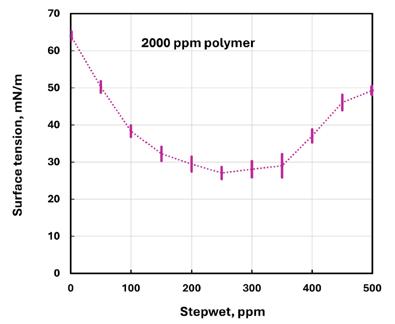 Surface tension was measured for surfactant solutions and surfactant–polymer solutions at room temperature using the pendant droplet method. The study uses these measurements as its direct readout of surface activity across the CHEC/Stepwet composition sweep.
