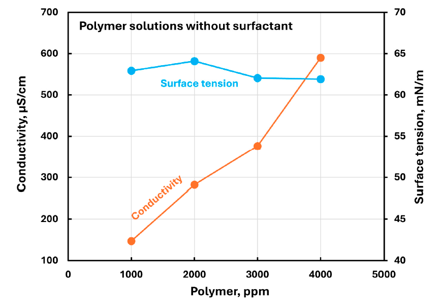 The paper frames polymer–surfactant interactions as important to applications such as enhanced oil recovery, hydraulic fracturing and drilling fluids, and formulated products. In that context, surface tension served as the study’s direct measure of surface activity alongside rheology and conductivity.