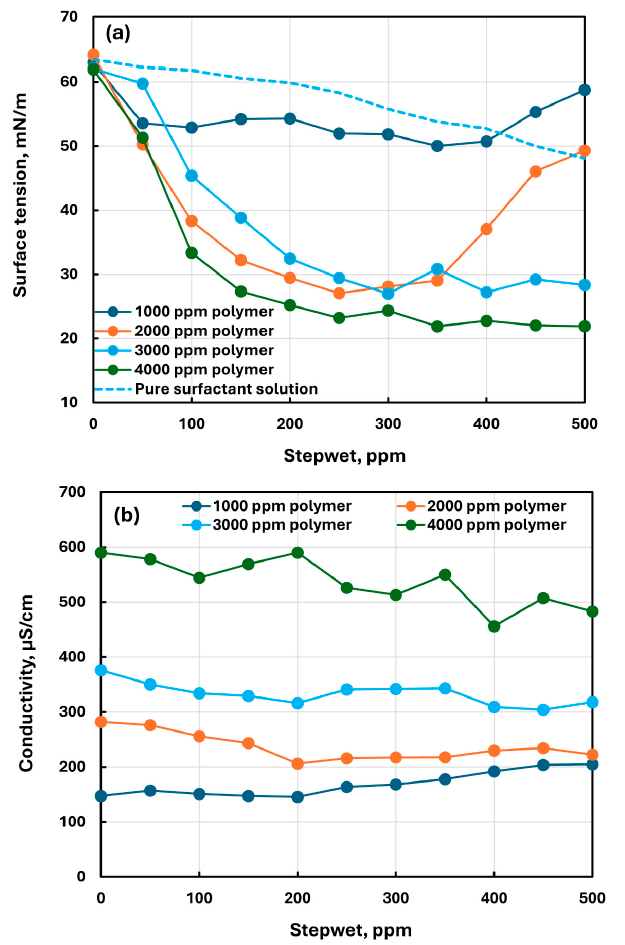 CHEC–surfactant mixture sweep 2000 ppm 0–500 ppm Tracks surface-tension minimum behavior at intermediate surfactant concentration Electrical conductivity; power-law K and n Pendant drop tensiometer; Thermo Orion 3 Star conductivity meter; Fann/Haake viscometers Known surfactant added to polymer solution and mixed thoroughly for about 1 h at room temperature; room-temperature measurement Figures 7b and 8a; Table 3 reports mean and standard deviation values
