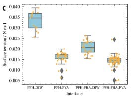 Boxplots and individual data points show the distribution of surface tension values for PFH/DIW, PFH/PVA–water, PFH + FBA/DIW, and PFH + FBA/PVA–water interfaces.