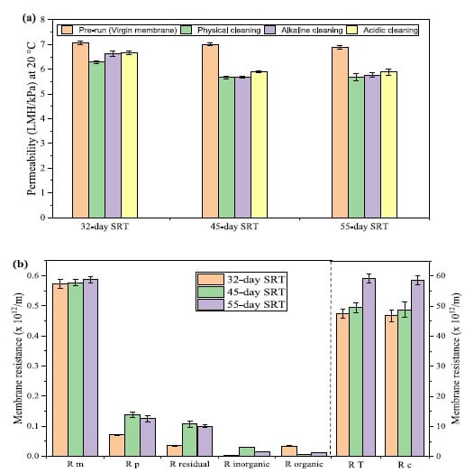Shows permeability of pristine membranes and employed membrane after physical/chemical cleaning and reports membrane resistances under different SRTs.