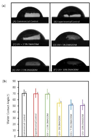The paper reports higher-DMADDM coating groups with lower water contact angles (UV+ 5%, 7.5%, and 10% DMADDM) compared with Commercial Control / Experimental Control / UV+ 2.5% DMADDM, with a significant difference between these sets (p < 0.01).